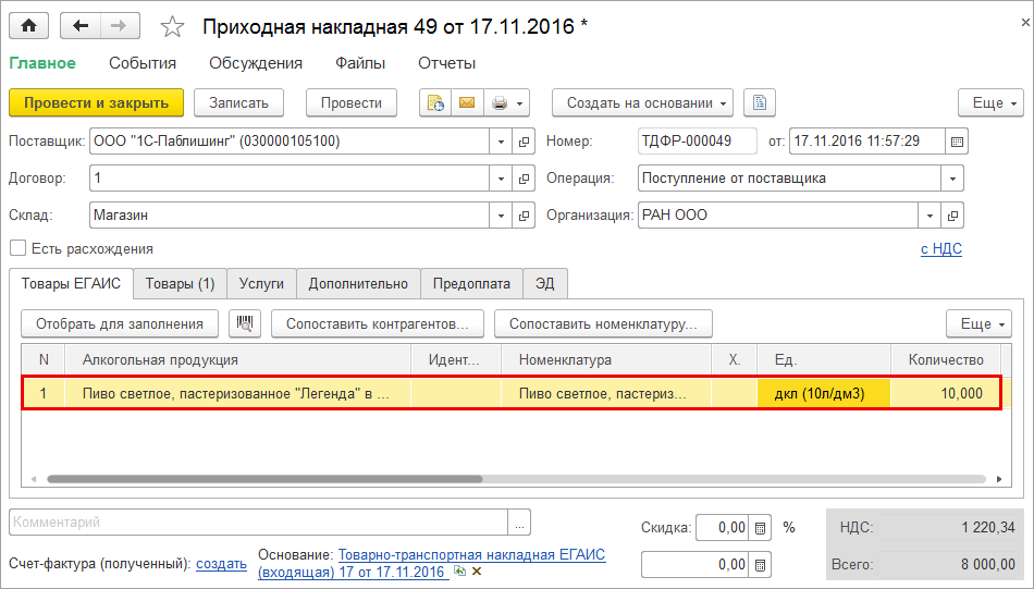 После проведения документа его следует передать в ЕГАИС с помощью команды