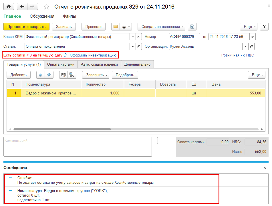 При закрытии кассовой смены программа сообщит пользователю, что появились отрицательные остатки и предложит оформить инвентаризацию. На проведение документа недостаток товаров не повлияет.