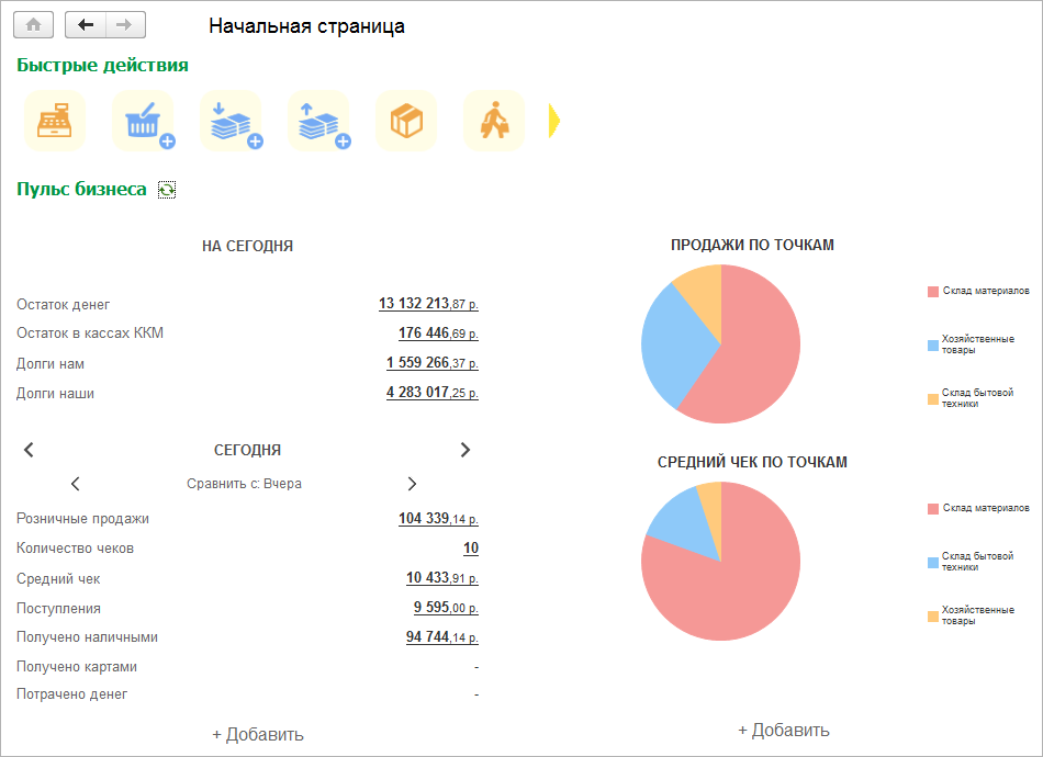 Так будет выглядеть рабочий стол Пульс бизнеса с включенными показателями (например при переходе из 1С:Касса):