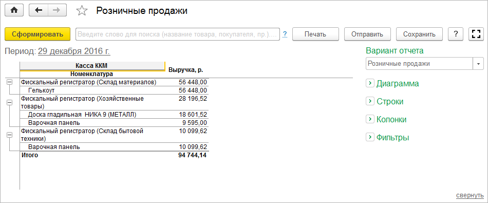 Любой показатель можно расшифровать, кликнув на него левой кнопкой мыши. Для расшифровки новых показателей добавлен отчет Розничные продажи. Данный отчет используется только для расшифровки показателей из пульса бизнеса и недоступен в общем списке отчетов.