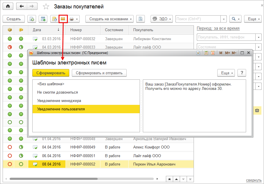 В новой версии формировать письма и смс по шаблону стало еще удобнее. Теперь с любым шаблоном можно работать не зависимо от документа или в связке с документом-основанием.