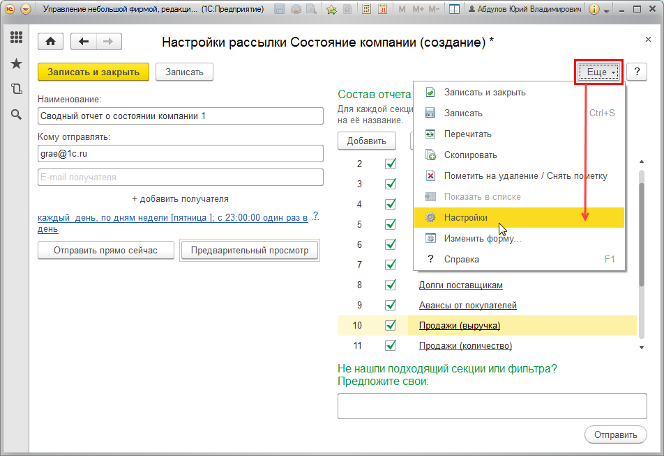 Также пользователь может самостоятельно включить/отключить рассылку и настроить её (изменить порядок и состав секций отчета, изменить заголовки секций, наложить отборы). Настройки рассылки доступны по ссылке Состояние компании в разделе Компания.