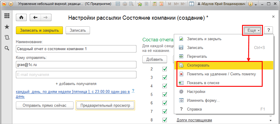 Добавлен механизм регулярной рассылки сводных отчетов о состоянии компании. С новым механизмом сводный отчет будет сформирован автоматически по заданному расписанию и отправлен руководителю по электронной почте.