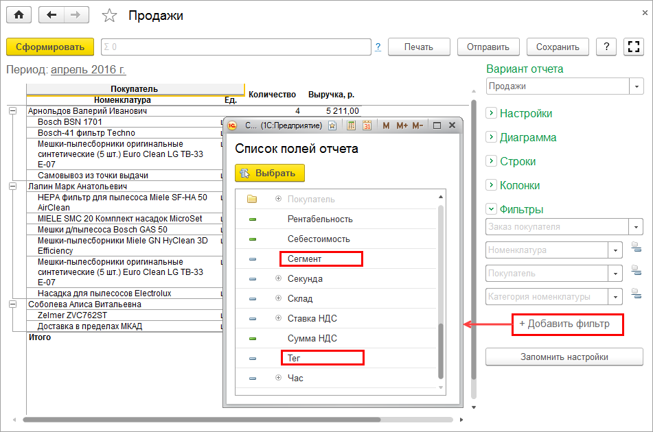 А еще добавлена возможность фильтрации данных в отчетах по сегментам и тегам контрагентов. Поля отбора Тег и Сегмент добавлены во все отчеты, формирующиеся в разрезе контрагентов.