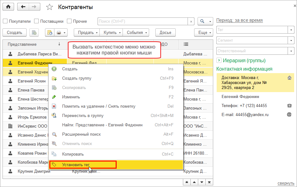 Для установки тега нужно выделить контрагента или нескольких (удерживая Ctrl) и выбрать в контекстном меню пункт Установить тег.