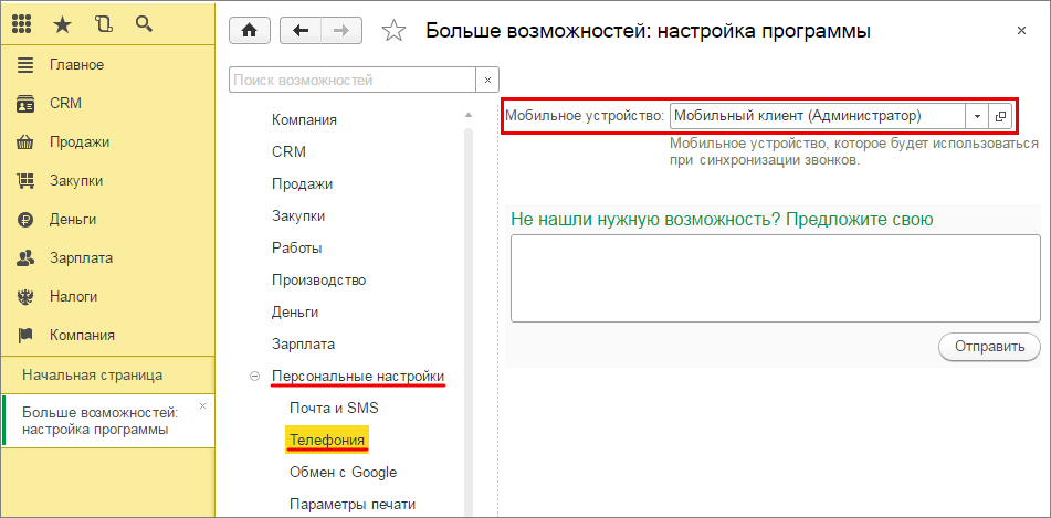 После того как синхронизация настроена, необходимо указать, что данное устройство будет использоваться для телефонии. Для каждого пользователя можно указать свое мобильное устройство. Сделать это можно в разделе Компания - Еще больше возможностей - Персональные настройки - Телефония.