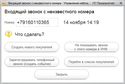 Принятый звонок будет обработан согласно настройке. Для известного абонента по умолчанию будет открыта карточка контрагента. Если телефон в базе не найден программа задаст вопрос, как поступить с входящим звонком.