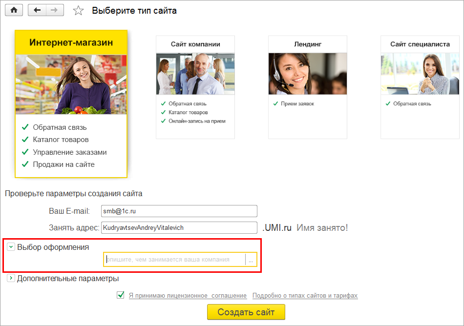Теперь при создании сайта UMI из 1С:УНФ, можно сразу выбрать дизайн, подходящий именно для вашего бизнеса. Более 550 профессиональных шаблонов для оформления сайтов.