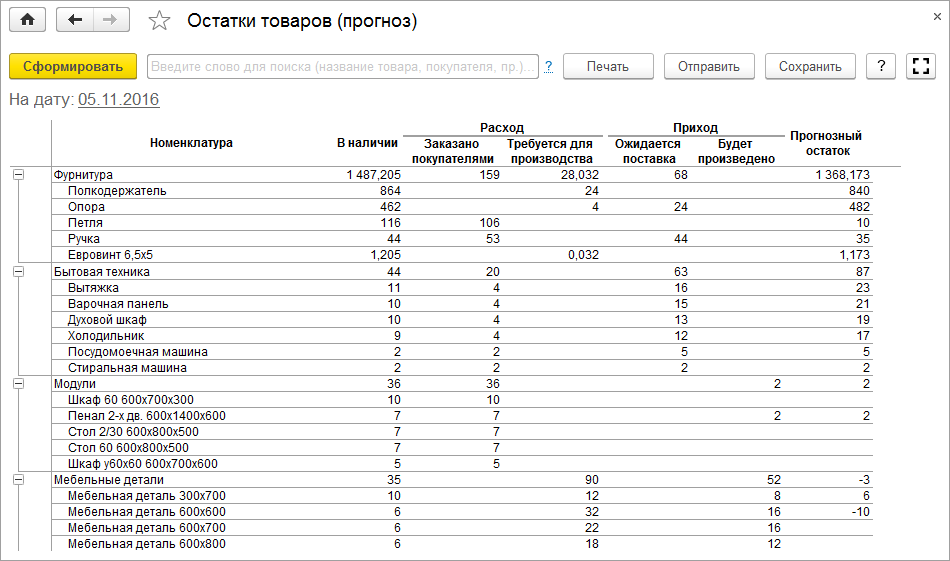 Данные представлены в количественном выражении, группируются по номенклатуре (иерархия) или категориям номенклатуры.