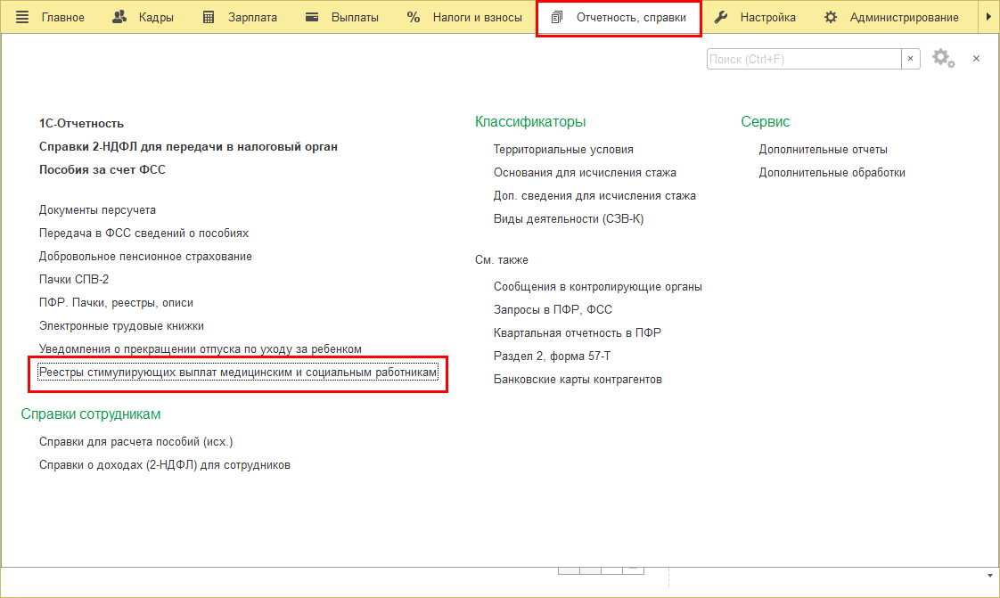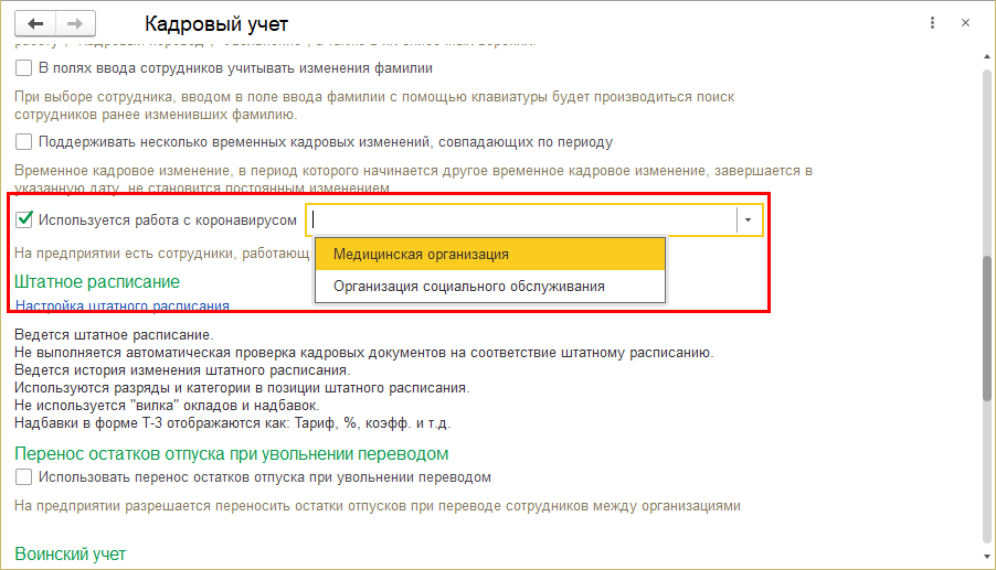 Добавлен документ "Реестр стимулирующих выплат медицинским и социальным работникам". Для его использования в настройках кадрового учета необходимо указать, что используется работа с коронавирусом, и уточнить вид учреждения.