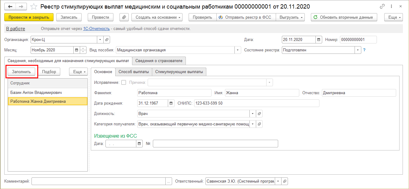 После этого по кнопке "Заполнить" документ автоматически заполняется сотрудниками, у которых в карточке должности указана категория, и на которых введен документ "Перевод на работу с коронавирусом" (https://its.1c.ru/db/updinfo#content:836:1:issogl1_1) с периодом, приходящимся на указанный в реестре месяц. Также сотрудников можно подобрать и вручную по кнопке "Подбор".