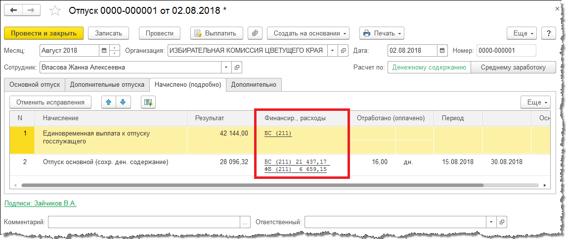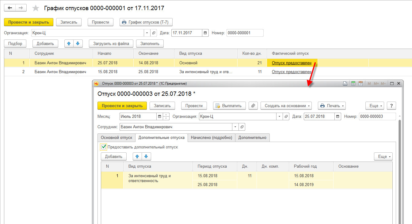 При наличии в документе "График отпусков" основного и дополнительного отпуска со смежными периодами по команде "Оформить отпуск" теперь создается документ, включающий основной и дополнительный отпуск.