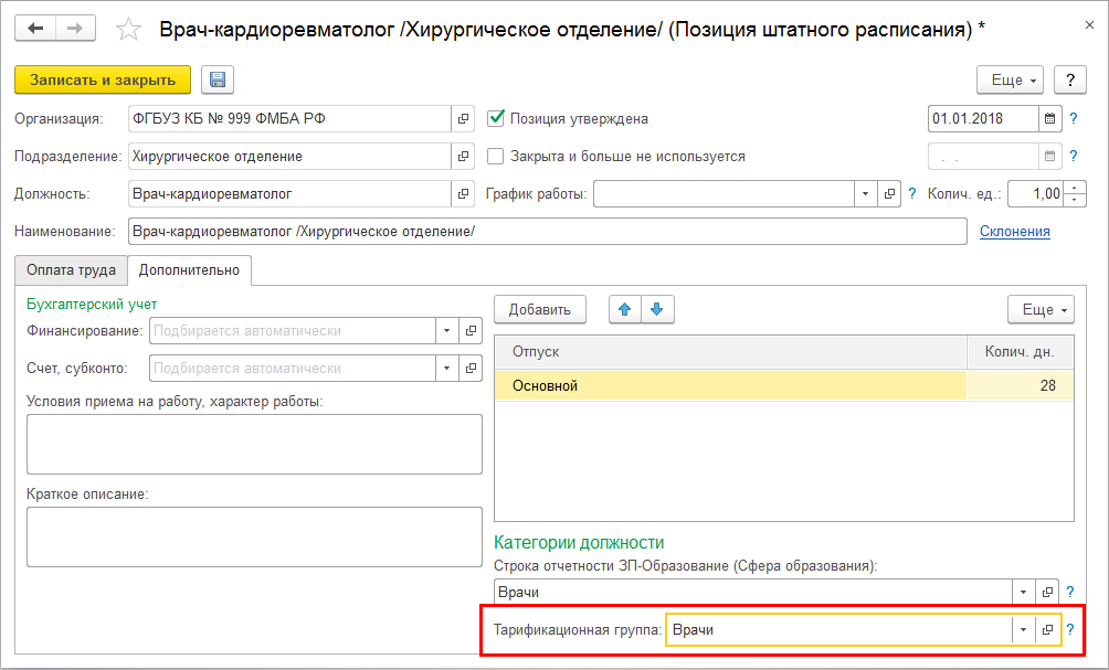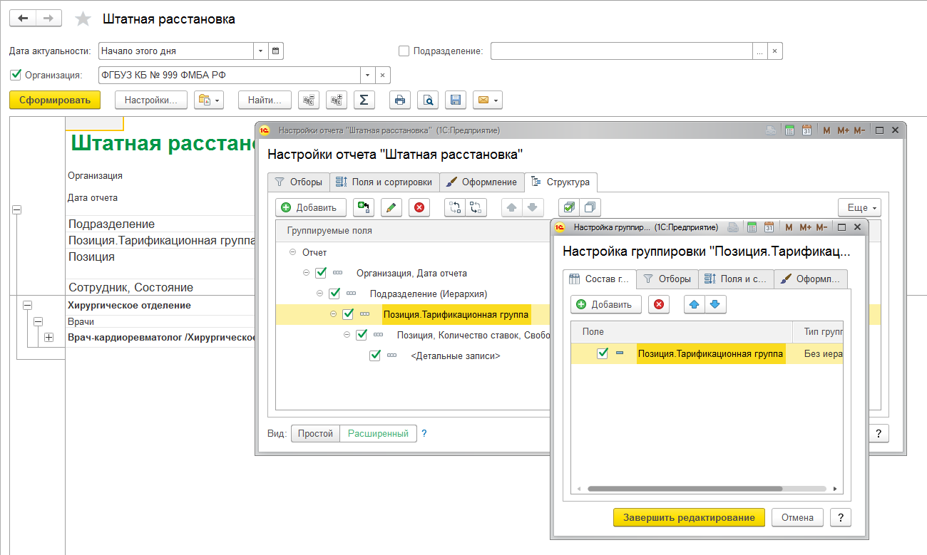 В ряде отчетов теперь помимо позиции штатного расписания возможно использование специфических характеристик этих позиций. Например, если ведется учет в медицинском учреждении и используется тарификация, то в отчете "Штатная расстановка" можно использовать свойство позиции – "Тарифная группа".
