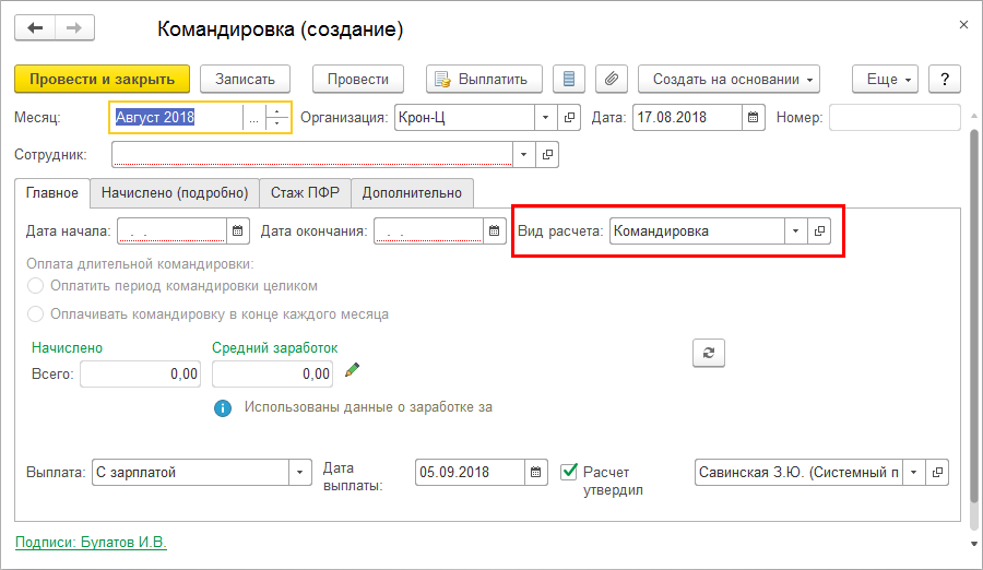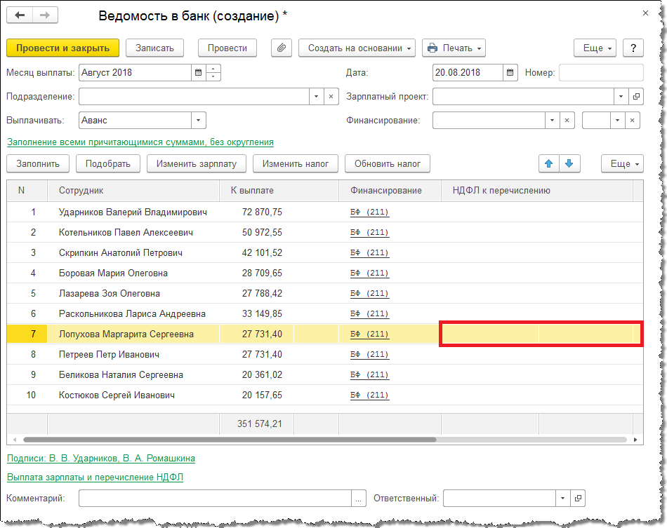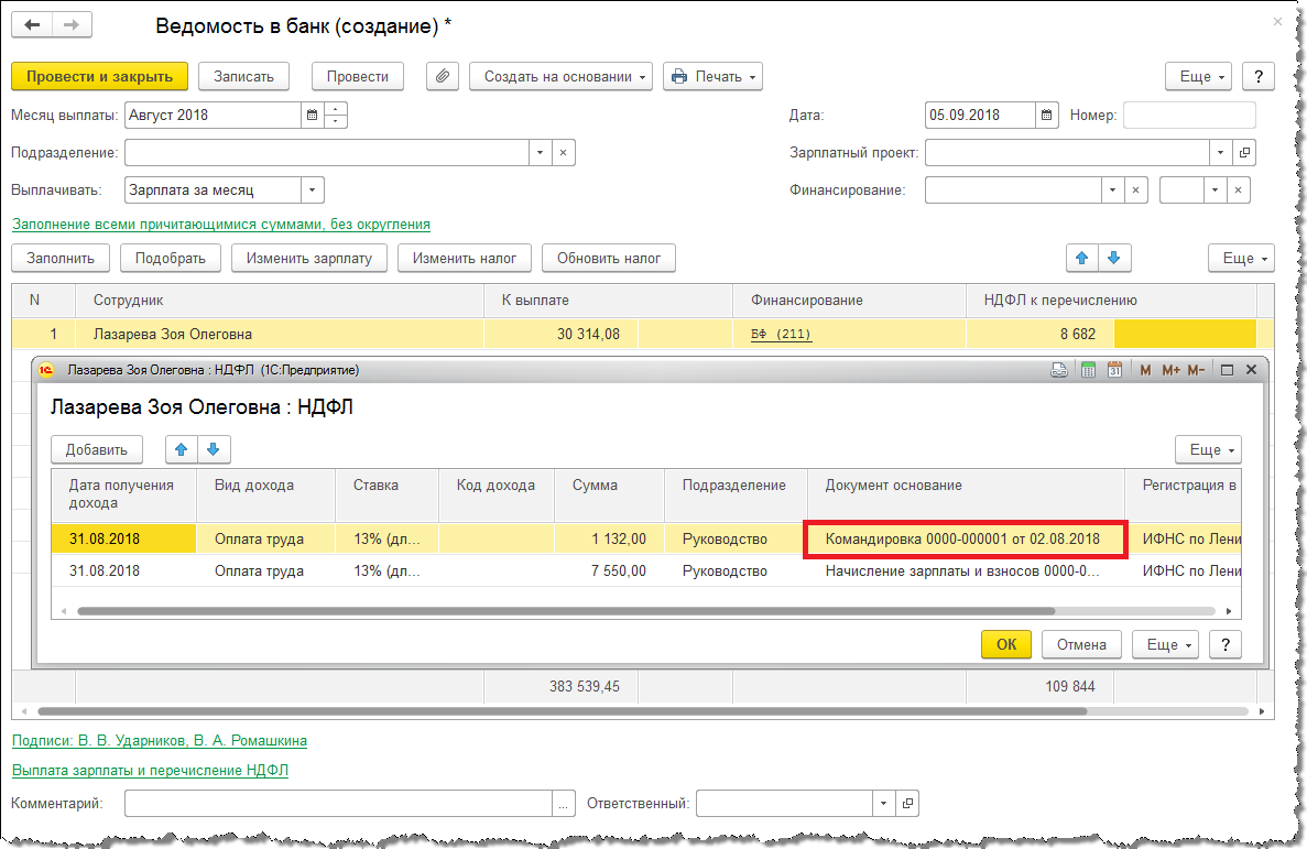 Если выбран вариант При выплате зарплаты после окончательного расчета, при заполнении ведомости на выплату аванса исчисленный в документе Командировка НДФЛ не включается в сумму НДФЛ к перечислению.