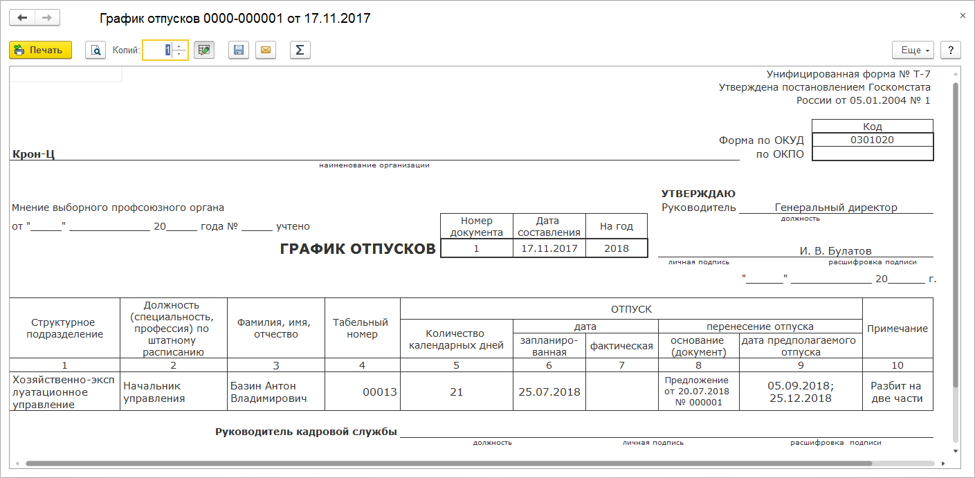 Также обращаем внимание, что в документе "График отпусков" появилась возможность ввести примечание, которое затем выводится в одноименную колонку Т-7.