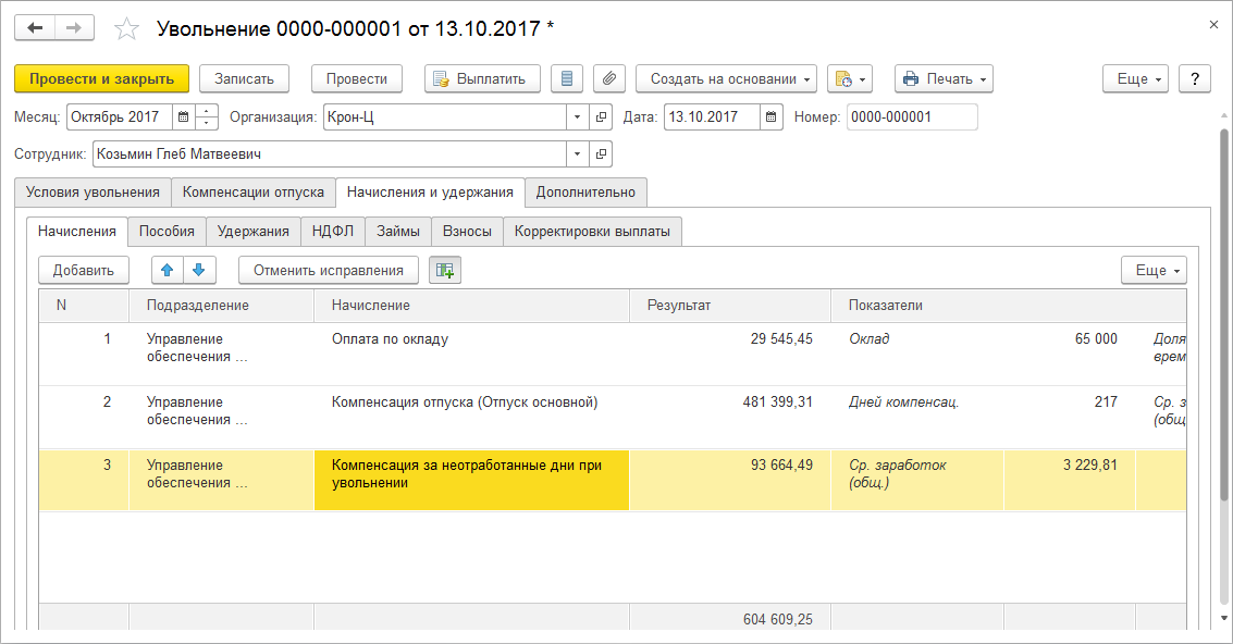 Указанные дни или часы умножаются на среднедневной или среднечасовой заработок сотрудника и начисляются вместе с остальными начислениями на закладке "Начисления и удержания". Для этого в программе поставляется новое начисление "Компенсация за неотработанные дни при увольнении". Обращаем внимание, что как и уже имеющееся в программе начисление "Компенсация при увольнении (выходное пособие)", новое начисление не облагается НДФЛ и страховыми взносами, согласно законодательству и его разъяснениям.