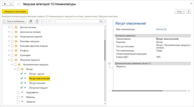 Для работы с сервисом 1С:Номенклатура необходимо сопоставить товарной категориям сервиса элементы справочника Виды номенклатуры (доступен из формы НСИ и администрирование – НСИ - Классификаторы номенклатуры, а также из справочника Номенклатура в режиме отображения по видам и свойствам). Новые виды номенклатуры можно добавить из сервиса и автоматически сопоставить их с товарными категориями сервиса по кнопке Добавить виды номенклатуры из сервиса 1С:Номенклатура. При этом открывается форма Загрузка категорий 1С:Номенклатуры. В форме категории отображаются в виде дерева, в котором необходимо отметить флажками нужные категории и нажать кнопку Загрузить категории. Виды номенклатуры создаются без иерархии товарных категорий.