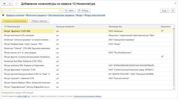При этом открывается форма Добавление номенклатуры из сервиса 1С:Номенклатуры. В верхней части формы отображается путь к выбранной товарная категория, а переход к детальным (вложенным) категориям осуществляется по соответствующим гиперссылкам под этой строкой. В таблице отображаются товары, внесенные в сервис 1С:Номенклатура по данной категории. По каждой позиции можно просмотреть дополнительную информацию (кнопка Открыть карточку) или создать новую позицию справочника Номенклатуры (кнопка Создать номенклатуру). При создании новой номенклатуры открывается карточка, автоматически заполненная данными из сервиса.