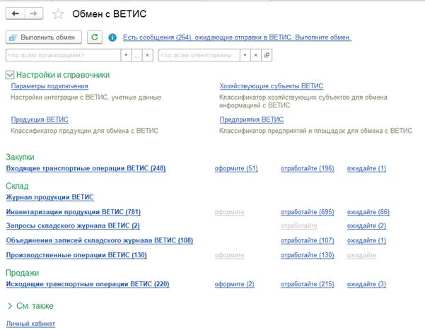 Все операции по работе с ВетИС объединены в рамках единого рабочего места Обмен с ВЕТИС.