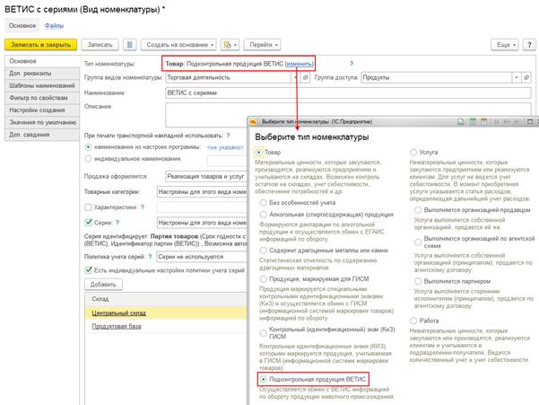 Для учета подконтрольной ветеринарному надзору продукции в прикладном решении необходимо использовать вид номенклатуры, для которого в поле Тип номенклатуры выбрано значение Товар: Подконтрольная продукция ВЕТИС.