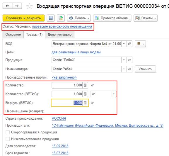 При частичной приемке поступившей продукции на предприятие-получателя в складской журнал предприятия ставится на учет часть принятой партии продукции, а на остаток автоматически формируется возвратный ветеринарный сертификат в адрес предприятия-отправителя (поставщика продукции). Если предприятие-получатель отказывается от всей партии поступившей продукции, то автоматически формируется возвратный ветеринарный сертификат на весь объем партии.