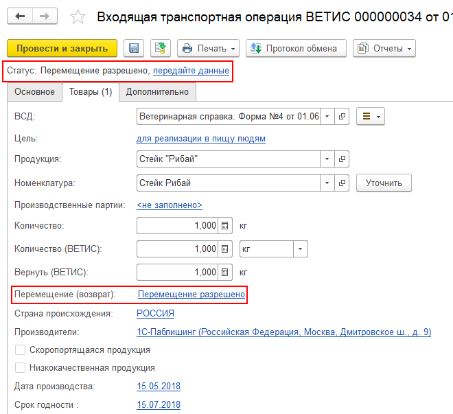 На каждую продукцию оформляется отдельный документ по входящей транспортной операции. Гашение ветеринарного сертификата выполняется на каждую продукцию ВЕТИС в отдельности. По результату гашения ветеринарного сертификата формируется новая запись журнала на предприятие-получателя.