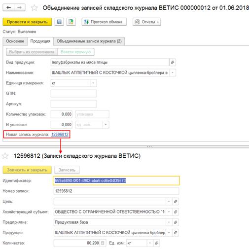По результату объединения указанных записей будет сформирована новая запись складского журнала продукции ВЕТИС и эта запись по умолчанию добавляется в журнал продукции ВЕТИС.