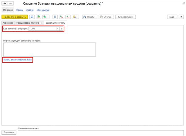 Реализована возможность прямого обмена (только в режиме 1С:ДиректБанк) с банком валютными операциями, включая выгрузку / загрузку документов: