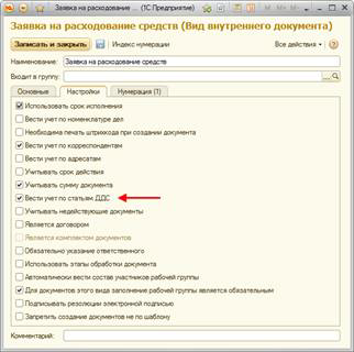 Рис. 1. Настройка «Вести учет по статьям ДДС» в карточке вида документа