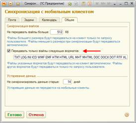 По умолчанию в настройках указаны форматы, которые поддерживаются мобильной платформой «1С»: TXT, LOG, INI, ICO, WMF, EMF, HTM, HTML, URL, MHT, MHTML, DOC, DOCX, DOT, RTF, XLS, XLSX, PPT, PPTX, JPG, JPEG, JP2, JPE, BMP, DIB, TIF, TIFF, GIF, PNG, PDF, ODT, ODF, ODP, ODG, ODS. Данный список можно отредактировать.
