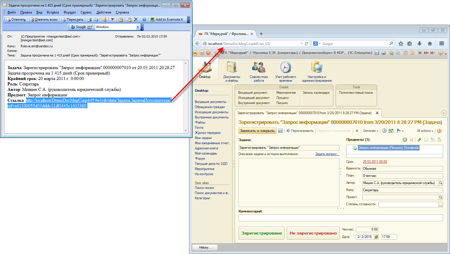 Теперь из уведомления, полученного сторонней почтовой программой, можно в один клик перейти в веб-клиент. Карточка предмета уведомления откроется сразу после авторизации. Раньше для этого надо было вручную выделить и скопировать ссылку в буфер обмена, открыть браузер, запустить веб-клиент, выполнить команду Перейти по ссылке и только после этого вставить ссылку в соответствующее окно.