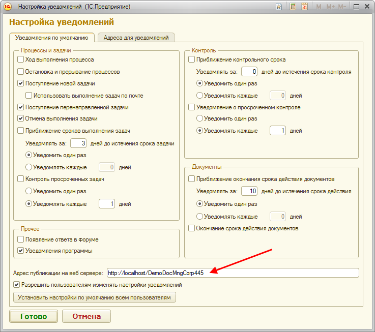 Для использования внешних ссылок уведомлений в настройках программы нужно прописать адрес публикации на веб-сервере:
