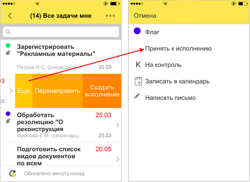 Для этого в меню Еще списка задач появилась команда Принять к исполнению.