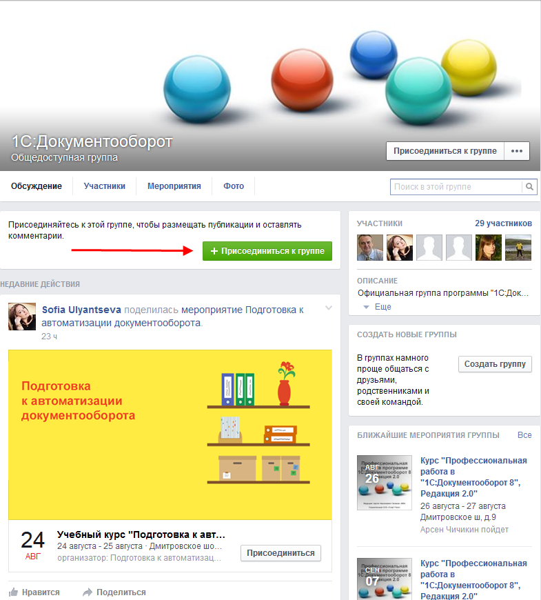 Рис. 18. Официальная группа «1С:Документооборота» в Facebook