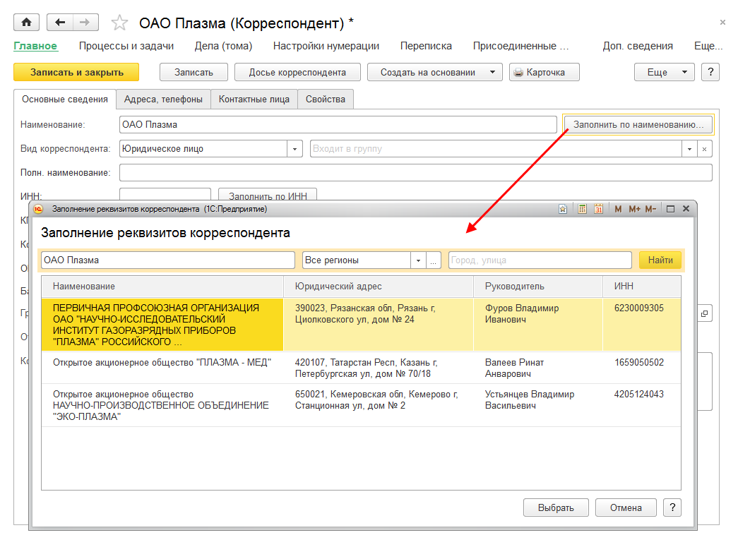 Для этого в карточке корреспондента достаточно ввести наименование и нажать кнопку Заполнить по наименованию.