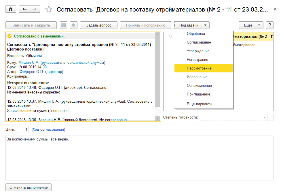 Подчиненные задачи создаются в основном для детализации работы, что никак не должно отразиться на состоянии предметов основной задачи. Например, руководителю пришел договор на согласование. Он поручил подчиненному провести аудит, результат которого не должен изменить состояние договора.