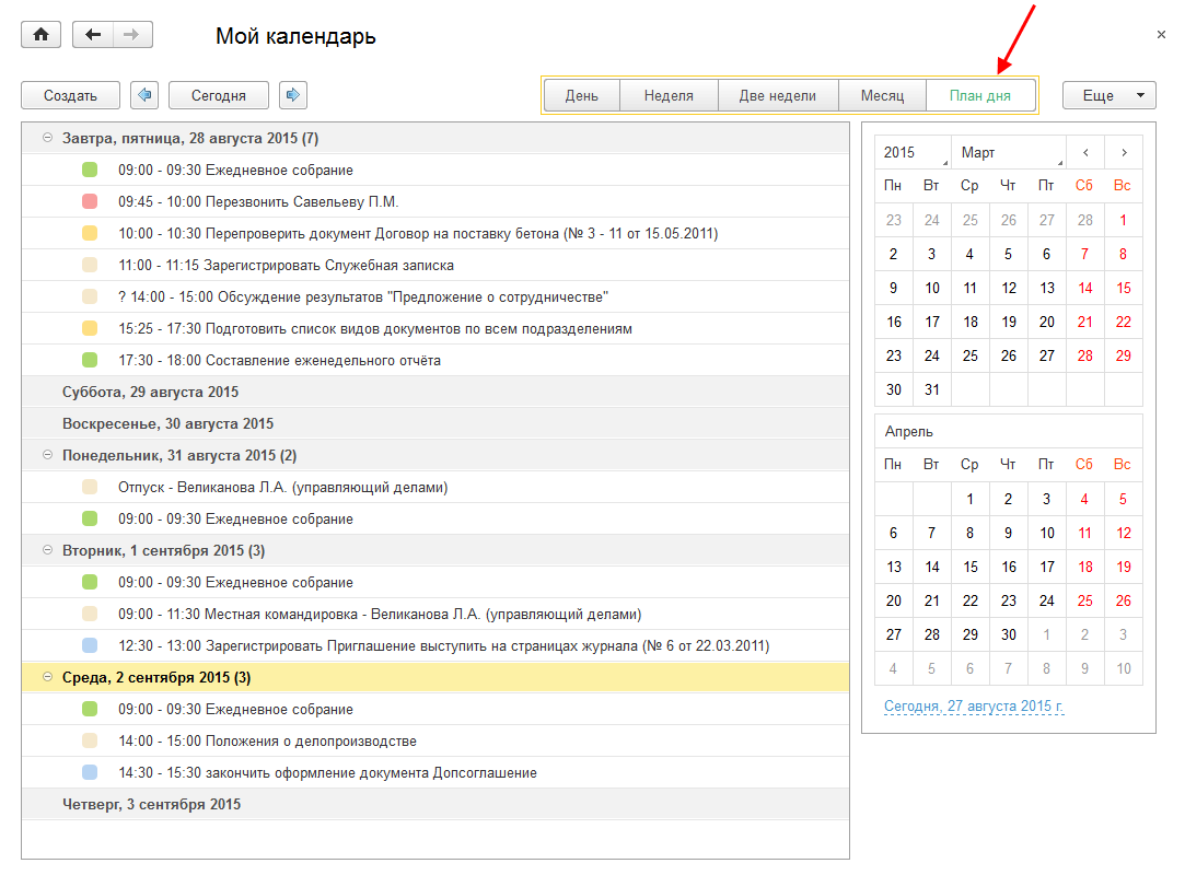 Рис. 11. «План дня» в календаре