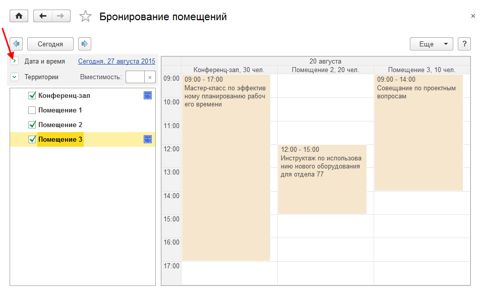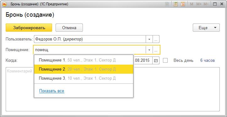 В списке выбора выводится вместимость помещения и территория, на которой это помещение находится.