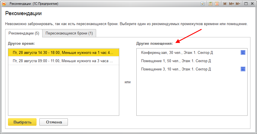 В окне рекомендаций появилась возможность выбрать другое помещение.