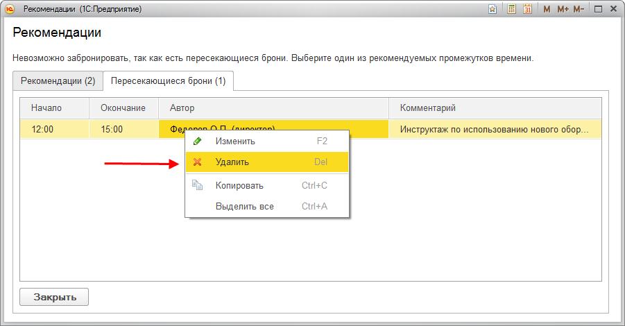 В новой версии программы прямо в окне рекомендаций можно пометить пересекающуюся бронь на удаление.