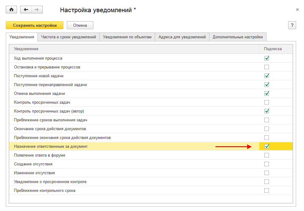 Для этого в персональных настройках уведомлений достаточно установить подписку Назначение ответственным за документ. При этом пользователь будет получать уведомление каждый раз, когда его назначают ответственным за документ.