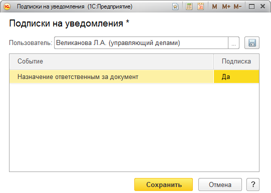 Рис. 18. Подписка на уведомление о назначении ответственным по виду документа