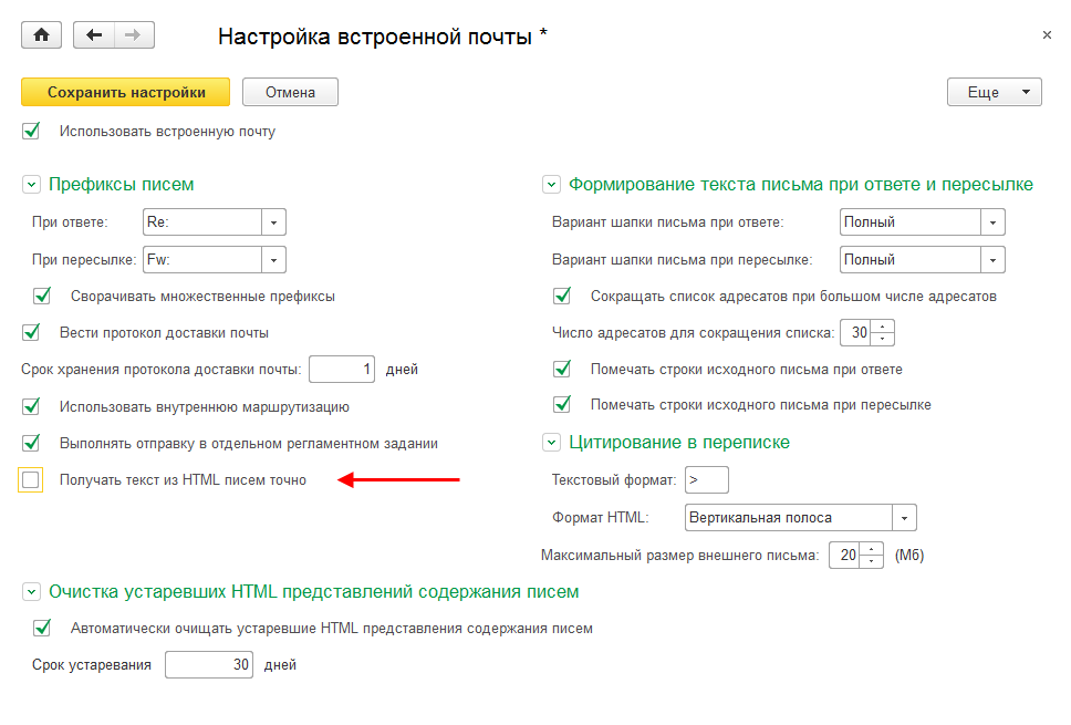 Рис. 19. Настройка почты «Получать текст из HTML-писем точно»