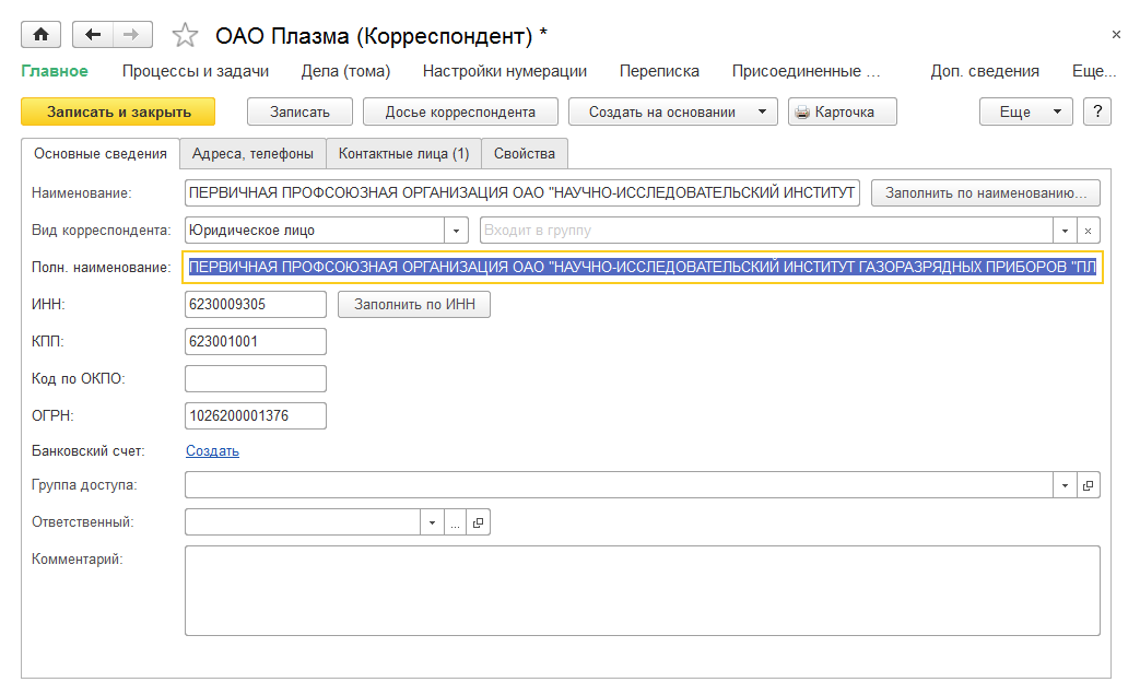 После выбора юридического лица реквизиты карточки корреспондента будут автоматически заполнены имеющимися в ЕГРЮЛ данными. Это могут быть: