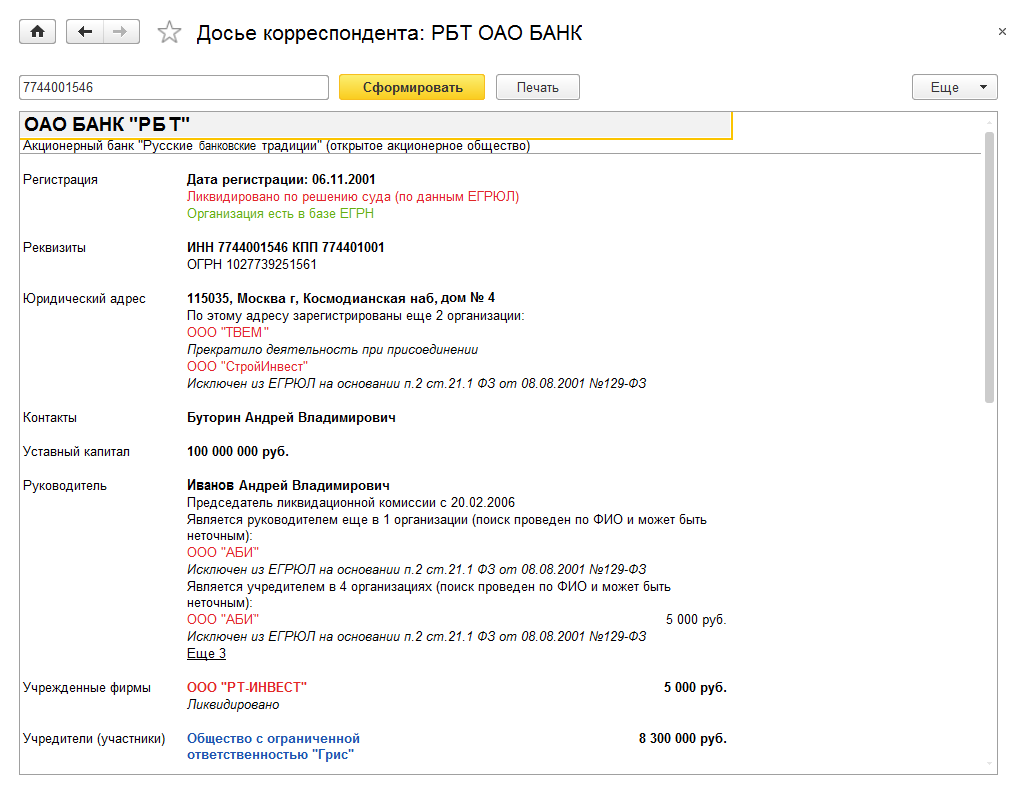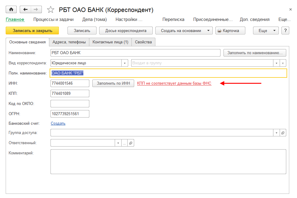 Обратите внимание: при повторном открытии карточки корреспондента дополнительная проверка не выполняется. Повторная проверка выполняется регламентным заданием Проверка корреспондентов с периодичностью раз в неделю.
