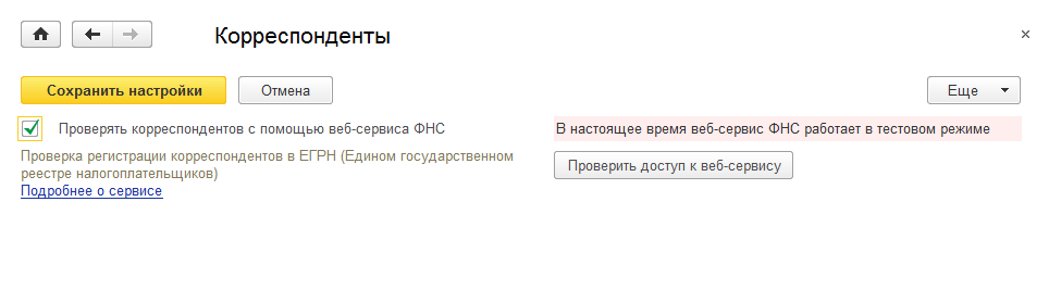 Чтобы включить новую возможность в окне Настройки программы – Корреспонденты необходимо установить флажок Проверять корреспондентов с помощью веб-сервиса ФНС. Здесь же можно проверить доступ к веб-сервису.
