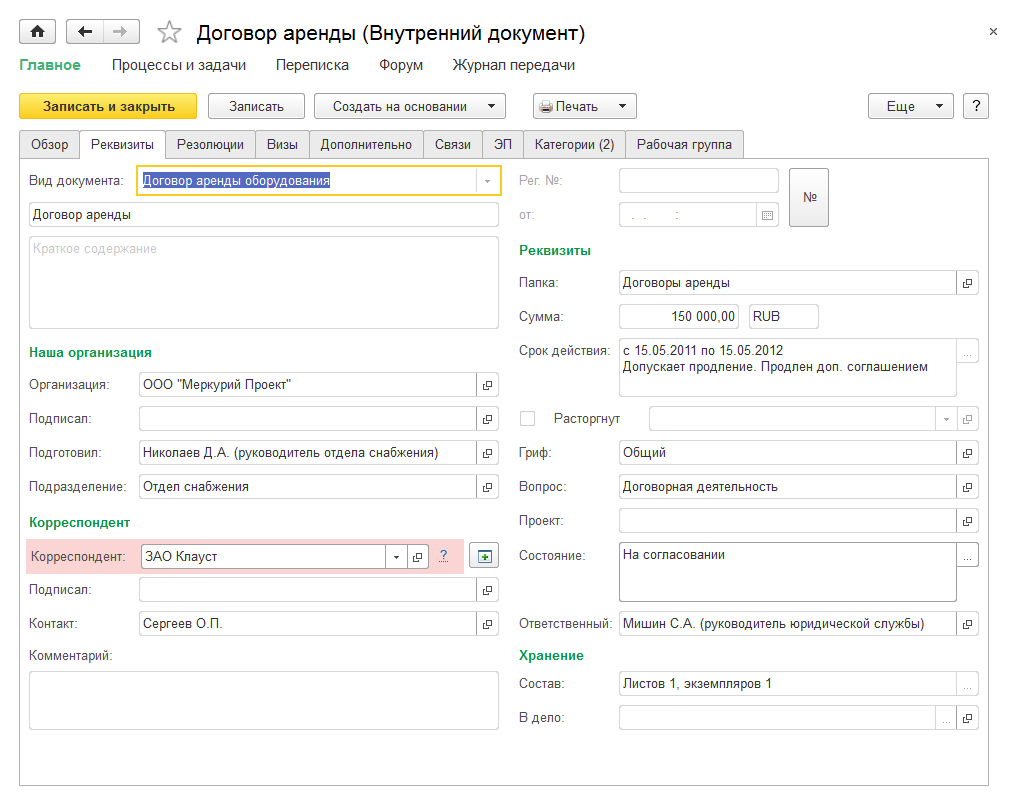 При выборе недействительного корреспондента в карточке входящего, исходящего или внутреннего документа, поле выделяется красным фоном.