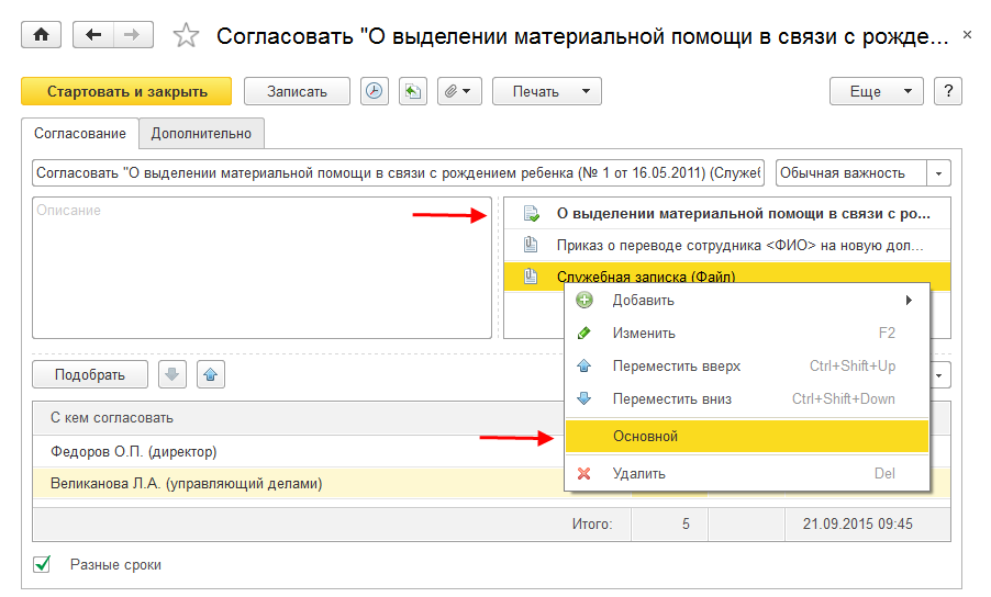 Основные процессы создаются чаще вспомогательных, поэтому в меню варианты основных процессов представлены в виде перечня операций: В обработку, На согласование, На исполнение и т.д.