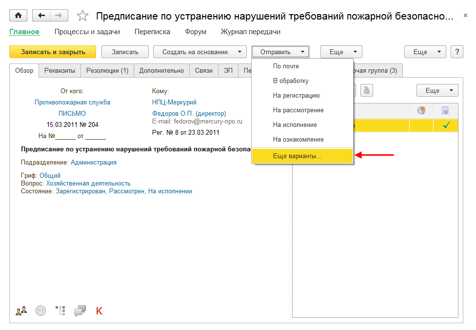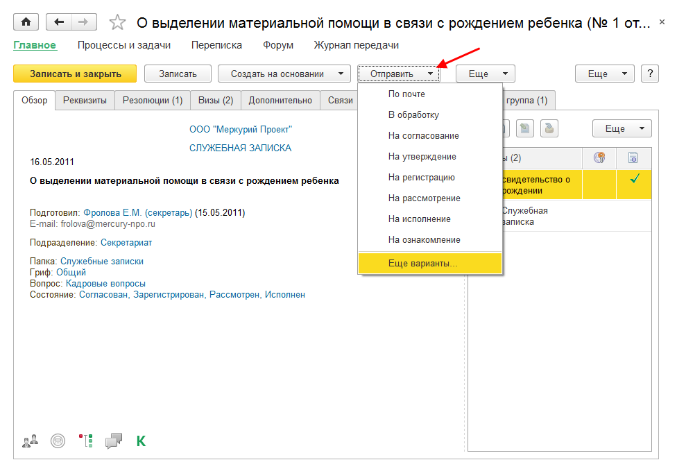 В новой версии программы для создания процессов на основании предметов предусмотрено меню Отправить.