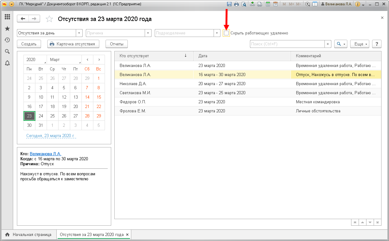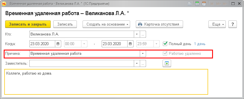 Чтобы узнать, кто сегодня работает дома, выберите в отборе Причина – Временная удаленная работа.